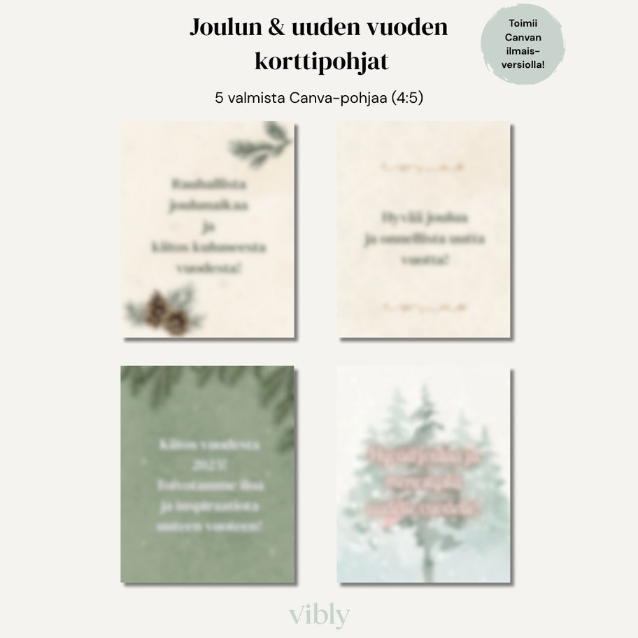 Vaaleat joulun korttipohjat Canvaan on minimalistinen ja rauhallinen korttipaketti, joka sisältää viisi suomenkielistä joulun ja uudenvuoden tervehdystä. Mallit sopivat täydellisesti yrityksille, jotka haluavat viestiä lämpimästi ja ammattimaisesti ilman raskasta suunnittelutyötä.